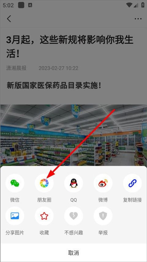3、打开分享设置,用户可以选择将内容分享给微信/QQ好友、微博、收藏、复制链接等,点击“朋友圈”即可进行分享;