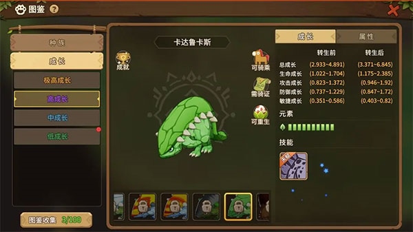 卡达鲁卡斯的防御成长最高可达1.229,并且自带石化皮肤这一被动天赋技能,进一步增强了承伤能力。在战斗中,它还能通过运气控制敌人,堪称新手期必备宠物之一。