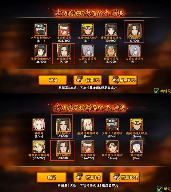 2、单独招募一次后,可以继续进行第二次十连抽。如果第一次十连只得到1片S碎片,单抽之后,第二次十连抽就会增加到6片。此时,抓住机会继续十连抽,直到十连中再次抽到1片S碎片,之后继续单抽,再进行十连抽,这样可以有效提高获得S忍者的概率。